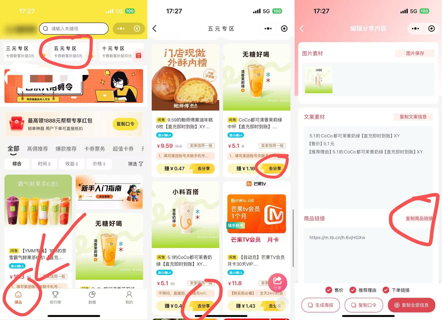 第二步:点击爆品-五元专区-找到COCO-分享链接-别人点击购买你就有钱